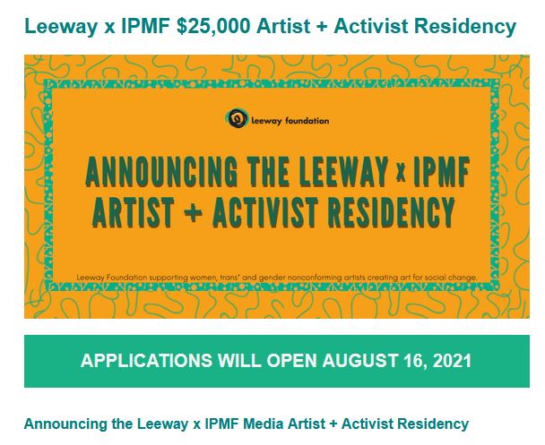 @leewayfound &@IPMFoundation Media Artist + Activist Residency - to be awarded to 3 artists each year w/ funding awarded to both the artist ($15,000) and the organization ($10,000) https://tinyurl.com/ytbcycnk pic.twitter.com/uYS0mR7AwL