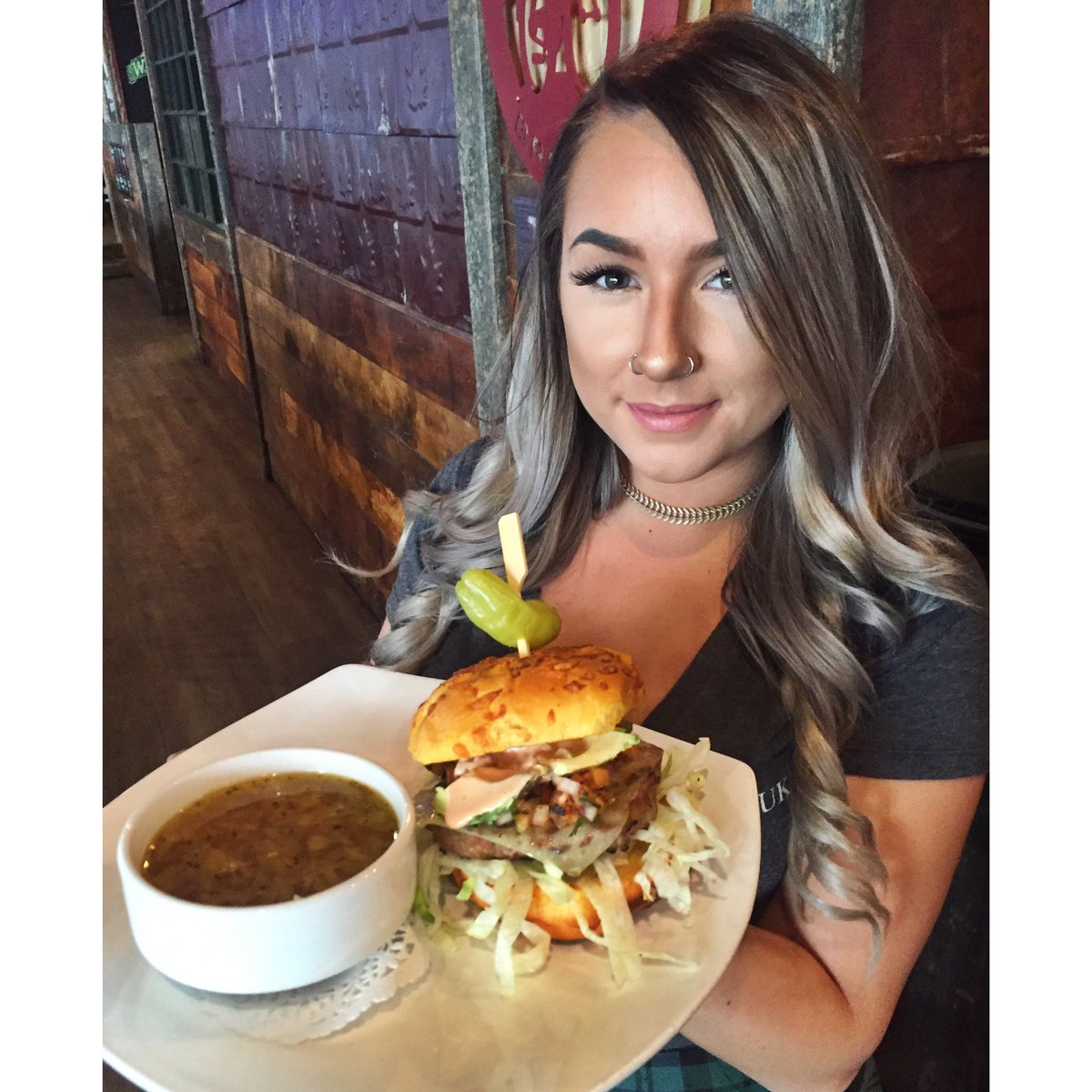 All beef burger with a Tex mex spin... w/lettuce tomato and avocado on a cheese bun & our soup is a cabbage and turkey sausage!