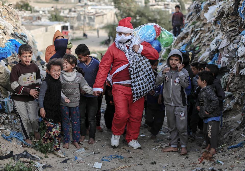 A Palestinian man Mohammed Abu Hajar, 28, dresses like Santa Claus and celebrates with children at Nahr al-Bared refugee camp in Khan Younis in the southern Gaza Strip.pic.twitter.com/fCKYKn5L4x