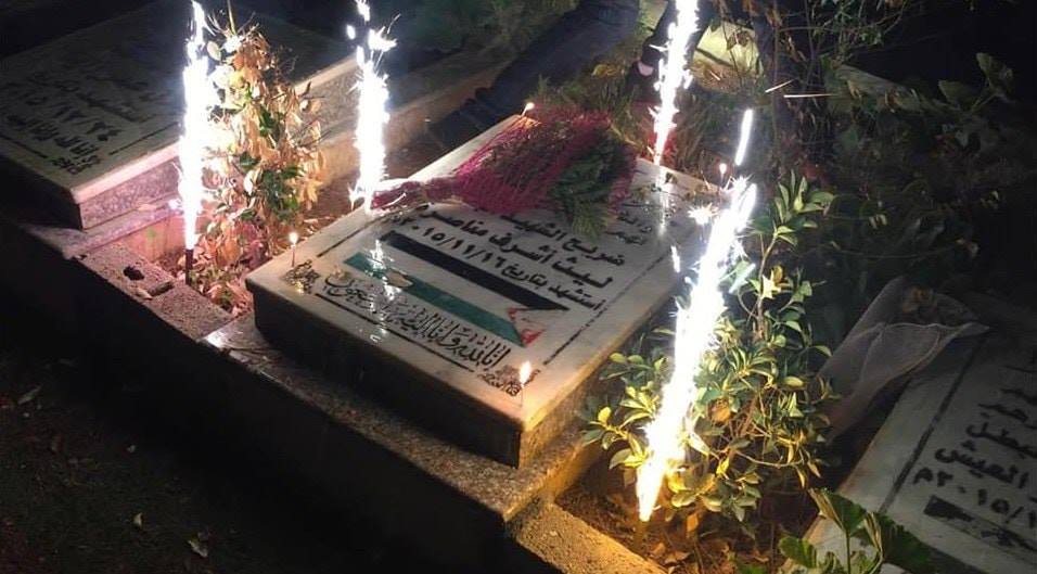 Celebrating his birthday, family of the Palestinian martyr Laith al-Shoani light candles around the tomb of their slain son last night in Qalandiya neighbourhood.pic.twitter.com/9lgMapWbtD