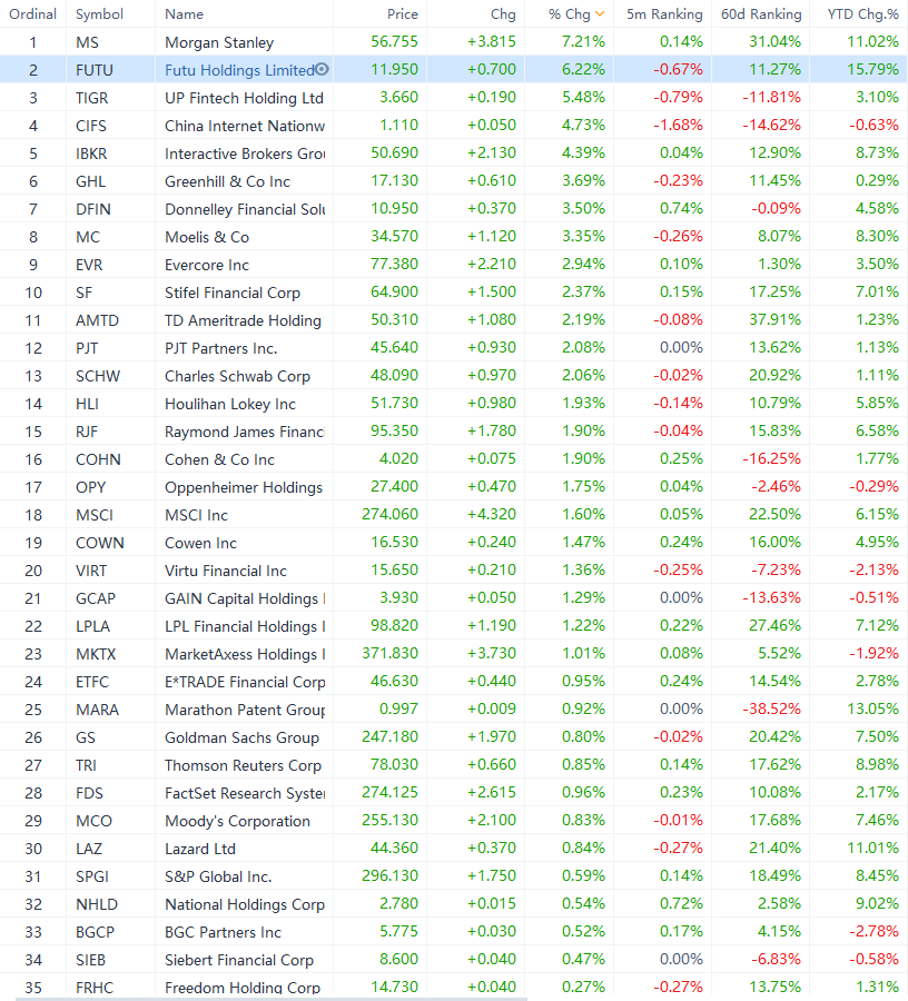 The Capital sector gained more than 2% in mid-day, led by $MS. $FUTU climbed 6%.