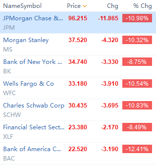 The financial sector lost a lot. $XLF declined over 8%, $JPM and $BAC are down by 10%.