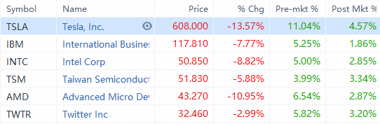$TSLA gained over 10%, $AMD, $INTC, $IBM all advanced over 5% in the pre-market.