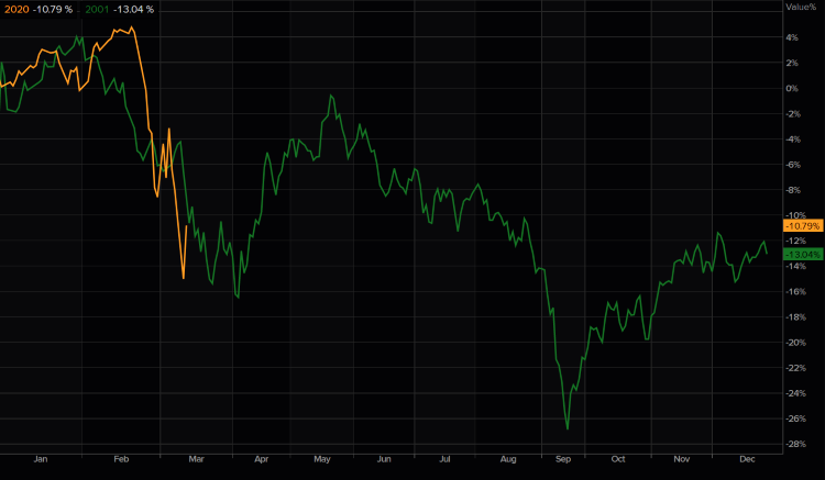What if this is just a replay of 2001? Lot of guys pointing out the great 1929 crash, but few of "us" were trading back then. To us this "feels" a lot like 2001. $SPX comparison 2020 vs 2001 in percent. #stockmarketcrashpic.twitter.com/b177pXcjjy
