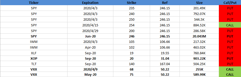 #Options market now has had a reset where it re-asses the #coronavirus impact from here. Massive Puts order flow fired toward $SPY, $XLF. Among 4/1 bets, #Volatility clusters headed up once again with $VXX near-term long side calls loaded up.pic.twitter.com/VRsR3QnKH7