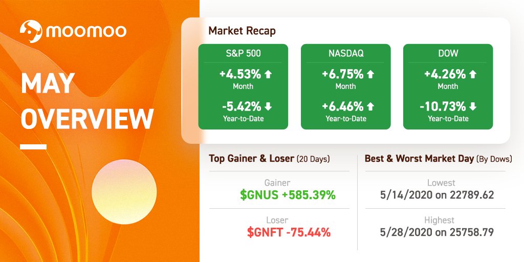 ⭕ May Overview⭕ S&P 500 +4.53% NASDAQ +6.75% DOW +4.26% Top Gainer $GNUS +585.39% Top Loser $GNFT -75.44% Highest MKT Day 5/28 25758.79 Lowest MKT Day 5/14 - 22789.62 #stocks #stockmarket #monthlyoverview #marketoverviewpic.twitter.com/tkuNeLYB42