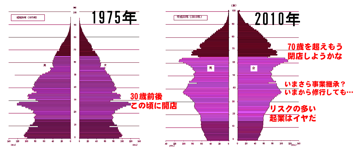 その背景には、手に職を付け食うために小さな起業をした70年代の多くの若者世代がいたんです。例えばラーメンブームを下支えした方々が70歳を超え廃業中ですが、ご子息は店を継がない。と同時に現在の30歳以下は起業とは上場ベンチャーをイメージしてハードル上げてるし、そもそもリスクを避けてる。pic.twitter.com/U6EZ8Zh2TZ