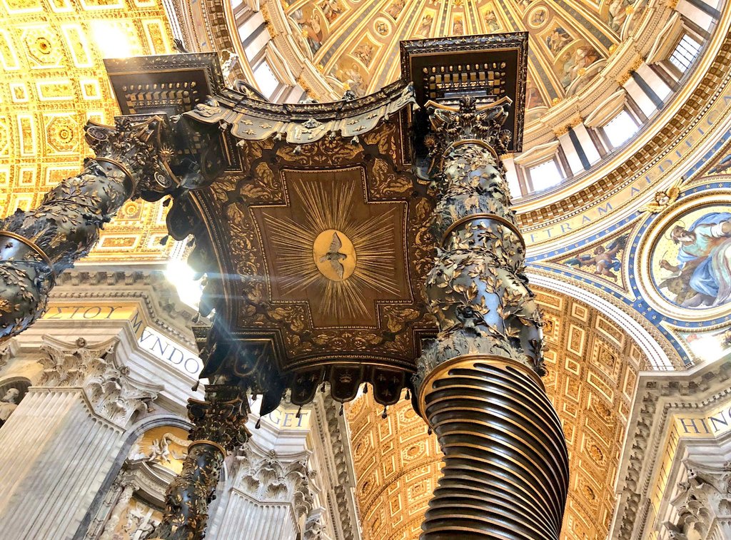 この「鳩」を蜜蜂にしなかったのがせめてもの良心か バルダッキーノのみならず、後陣に「聖ペテロの司教座」が供わる主祭壇もベルニーニの制作 どちらにも描かれた鳩は、三位一体説(父と子と精霊)のうちの精霊の象徴なんだとか もうここまでいくと、蜂バージョンも見てみたかった気がしないでもないpic.twitter.com/24mr8lgdRh
