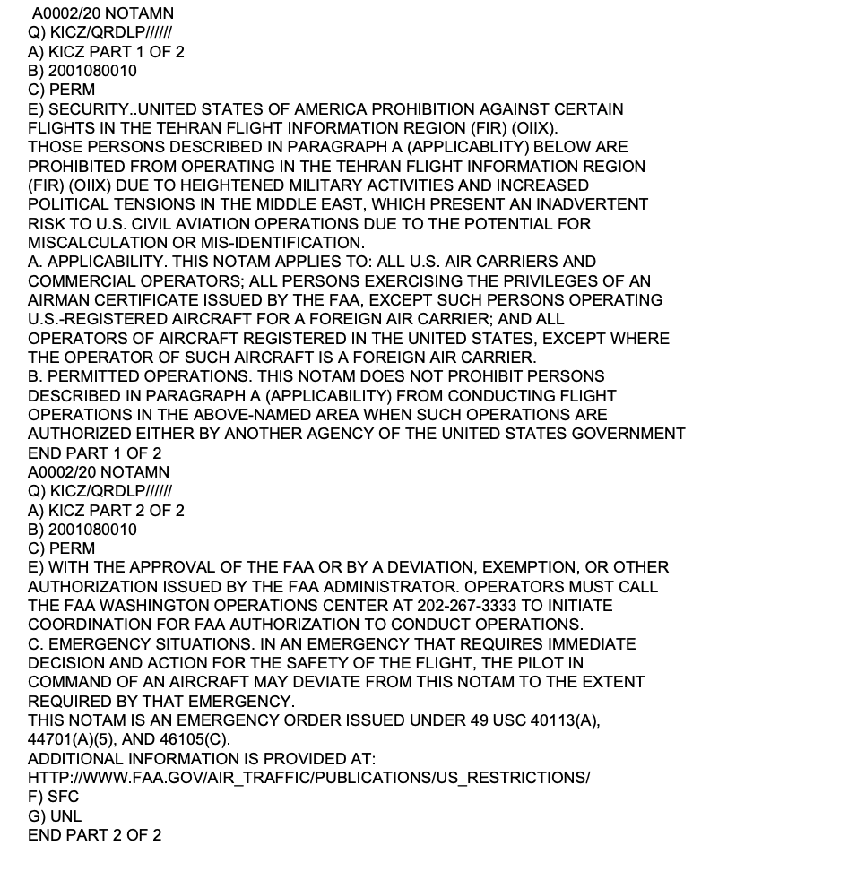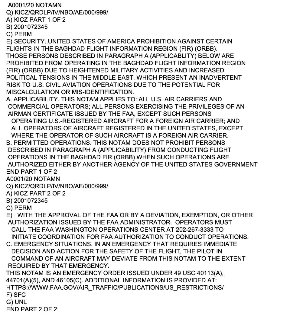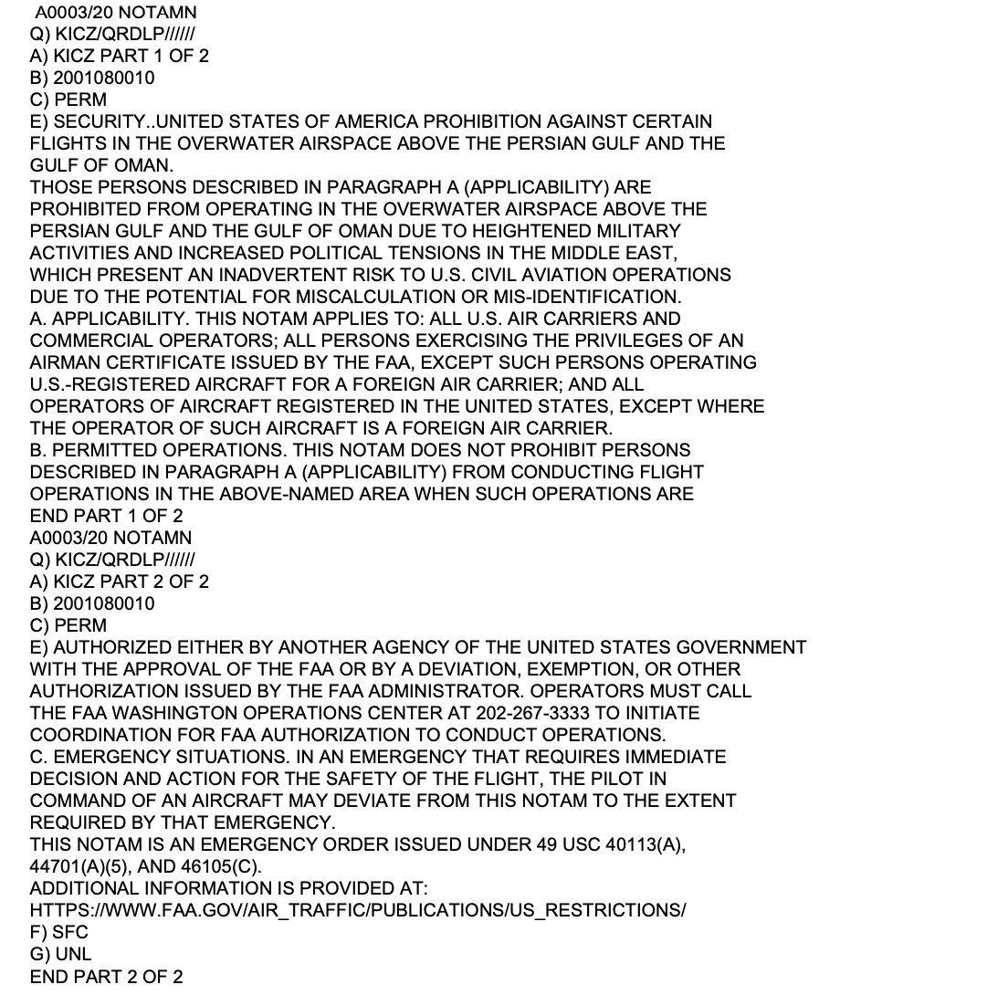FAA just out with three NOTAMs banning US operations (US air carriers, US-registered aircraft, licensed airmen) over Iran, Iraq, the Persian Gulf and the Gulf of Omanpic.twitter.com/dcmuqdASfb