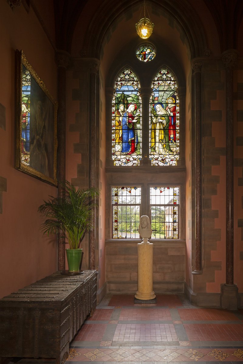 The Entrance Hall at Mount Stuart ticked each of these boxes, also offering the advantage of a beautiful backdrop of stained-glass windows designed by Nathaniel Westlake. The scene of ‘The Visitation’ is depicted and the pregnant Virgin Mary meets her cousin Saint Elizabeth