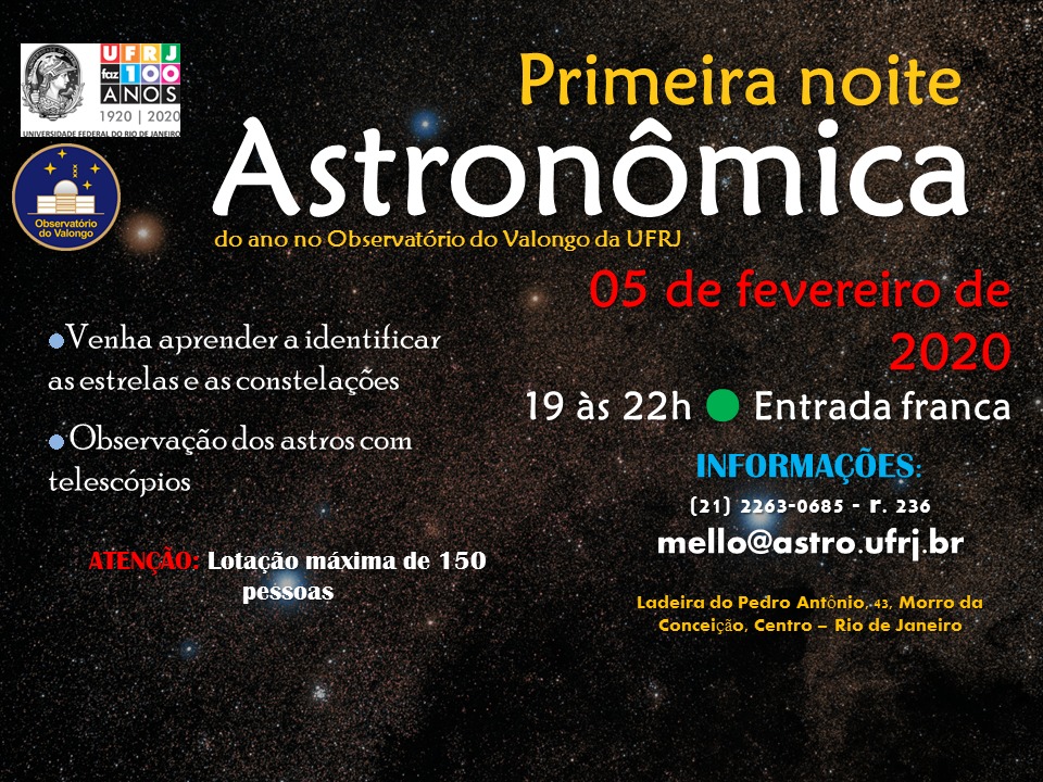 Primeira noite de observação astronômica do Observatório do Valongo em 2020! Dia 5 de fevereiro a partir das 19h. Entrada gratuita!pic.twitter.com/1sRWC0AzWm