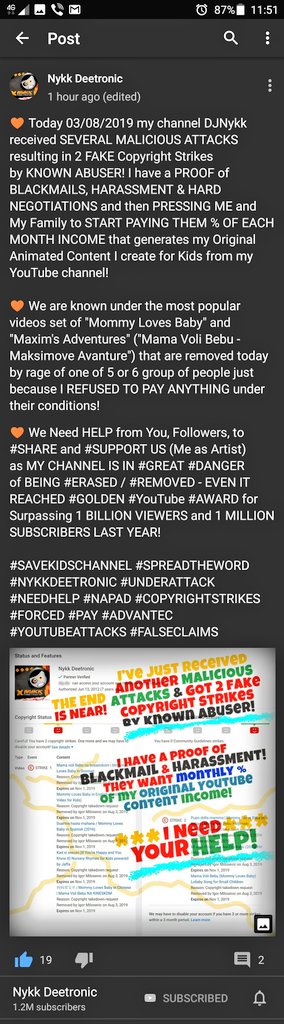 This guy @djnykk's @YouTube channel has suffered 2 ransom attacks in 1 day. That's 2 too many of those abusing the copyright claim mechanism's effectiveness and (most importantly) @TeamYouTube's slow response to distinguish. The platform is already becoming notorious for them.pic.twitter.com/c3kC7fMFzT