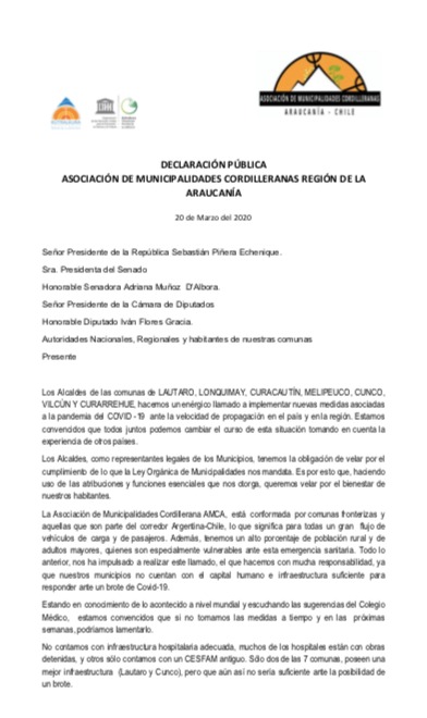 Declaración Pública Alcaldes Asociacion Municipalidades Cordilleranas de la Araucania.