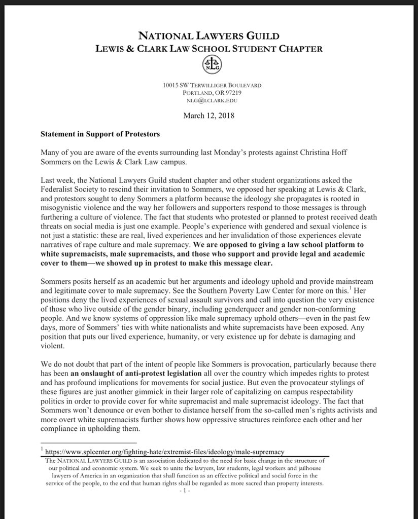 Update to @CHSommers Lewis & Clark incident. NLG chapter released a new statement in support of disrupters, cites SPLC & says they are opposed to platforming “white supremacists, male supremacists”pic.twitter.com/rbsYPGNqfw