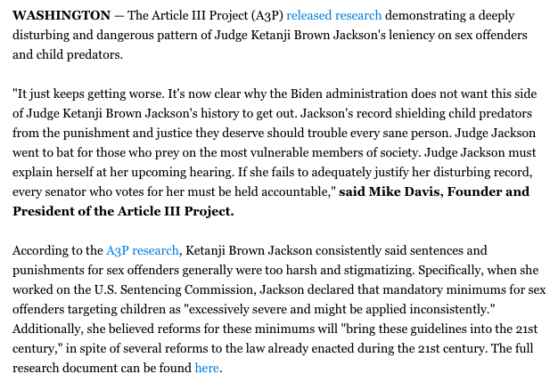 @Article3Project’s research clearly evidences this: For 25 years, Judge Ketanji Brown Jackson has advocated for lesser punishment for sexual predators of kids. This includes in law school, on the Sentencing Commission, and as a judge.https://twitter.com/article3project/status/1504893036622401548 …