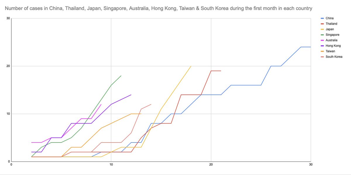 #Coronavirus-#Pandemie verbreitet sich in einigen asiatischen Ländern einschl.#Australien genau wie in#China. Absolute Zahlen zwar noch gering. Aber exakt so hat es in China begonnen. Nur ein paar Wochen früher. https://docs.google.com/spreadsheets/d/1Z7VQ5xlf3BaTx_LBBblsW4hLoGYWnZyog3jqsS9Dbgc/edit#gid=398006980 …pic.twitter.com/mhdvCYvXYL