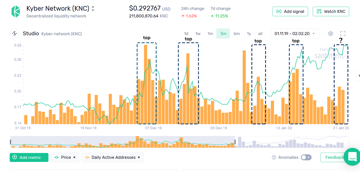 $KNC gained a very respectable 11% in the past week, hitting a 10-month high. On-chain activity and rising daily active addresses have been a factor, as well as sharp increases in social volume. Read our analysis on recognizing its tops, and what's next. https://insights.santiment.net/read/a-closer-look-at-knc%27s-%252B11%2525-week-5608?utm_source=twitter&utm_medium=post&utm_campaign=twitter_closer_look_at_knc_article_020120 …pic.twitter.com/Ln7AOyeejY