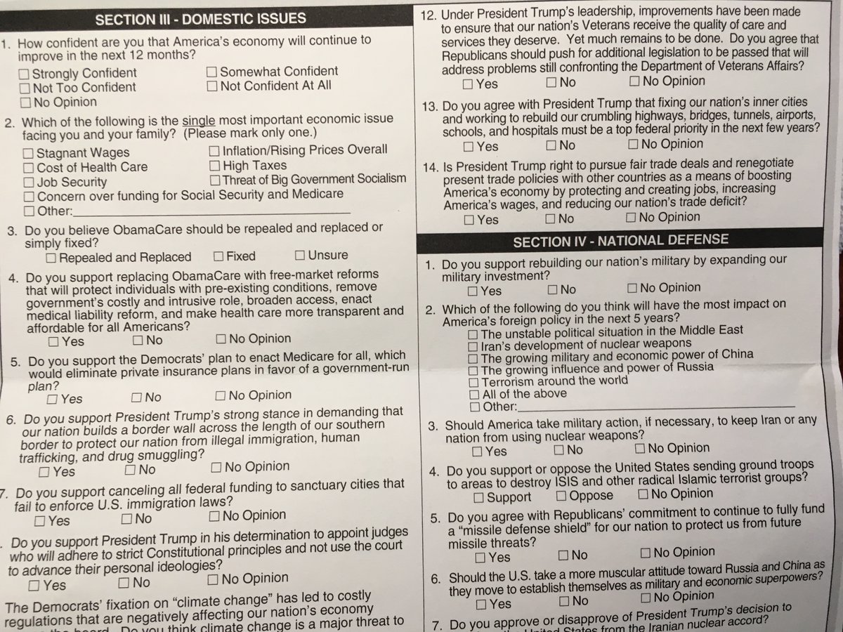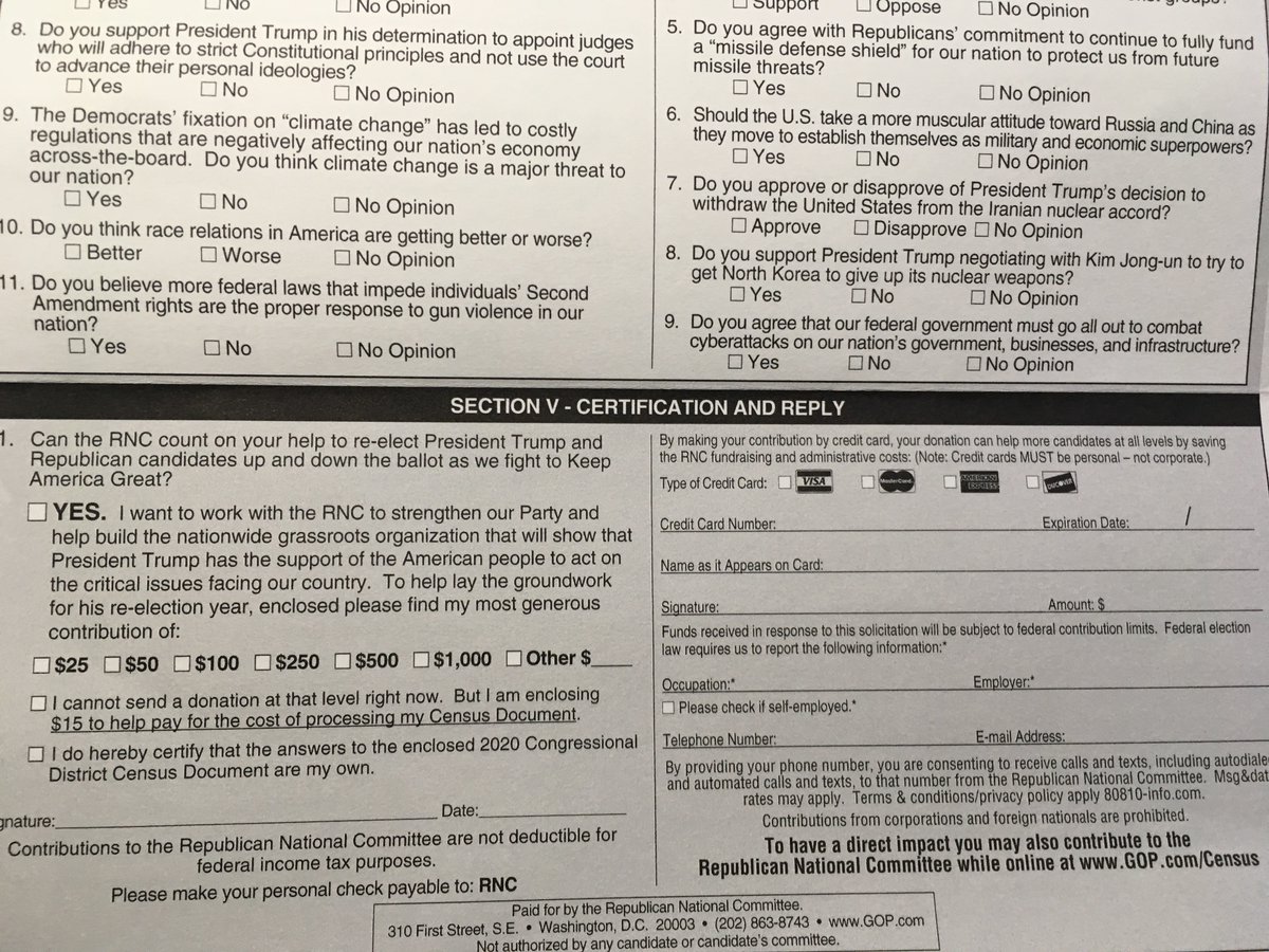This fundraising questionnaire from the Republican National Committee is designed to look like an official census form. It was mailed to a retired agronomist living in a nursing home in Ames, IA; he kindly gave me permission to share it. This kind of thing should be illegal.pic.twitter.com/UsspmMUClY