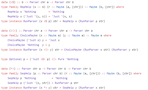 I have ... mixed feelings about the fact that this works. (Defunctionalized type-level parser combinators for parsing type-level token streams in