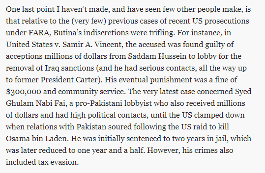 COMPARE & CONTRAST Here is how the Maria Butina sentence compares to old FARA cases. http://www.unz.com/akarlin/butina-sentenced/ … Conclusion: USA more hostile to Putin's Russia than it was to Saddam-era Iraq or the country that sheltered a terrorist who killed 3,000 of its own citizens.pic.twitter.com/9Mb44rC73h