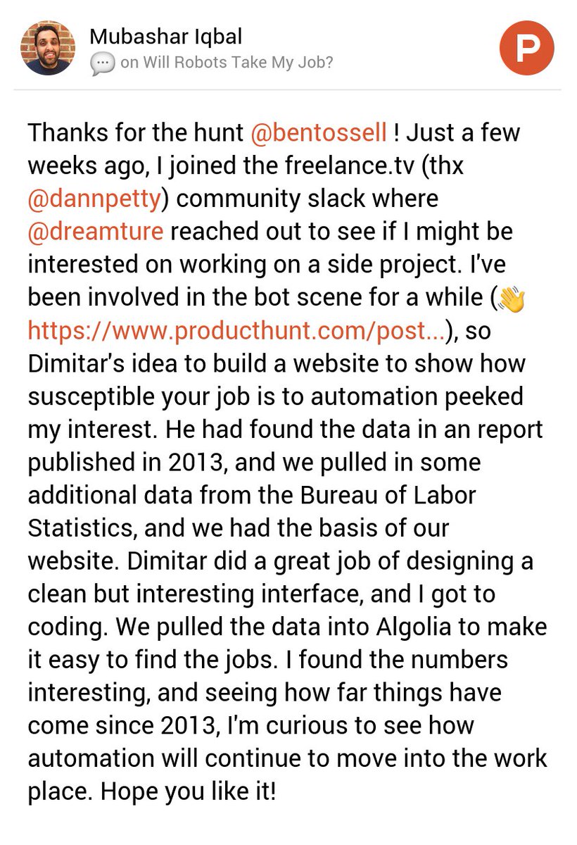 @ProductHunt cc@bentossell@DannPetty@dreamture https://www.producthunt.com/posts/will-robots-take-my-job#comment-475507 …pic.twitter.com/zQaJeT5kM2