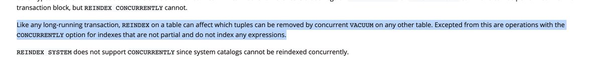 @PostgreSQL 14, rebuilding large indexes won't block VACUUM anymore: https://github.com/postgres/postgres/-/commit/d9d07622 … But: only if the index is not on an expression and is not partial: https://www.postgresql.org/docs/14/sql-reindex.html … So, large partial / functional indexes will be becoming unpopular?pic.twitter.com/r4zxX5katI