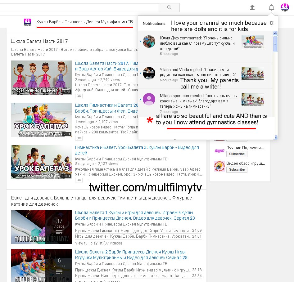 So good to know! My daughter inspired young girls to have gymnastics, ballet and dance classes, as illustrated on a screenshot. Unfortunately, her channel was blocked by mistake, but we beleive @TeamYouTube one day will screen our evidence https://twitter.com/multfilmytv/status/952977518956630018 … and unblock it!pic.twitter.com/Dq78FF4AcE