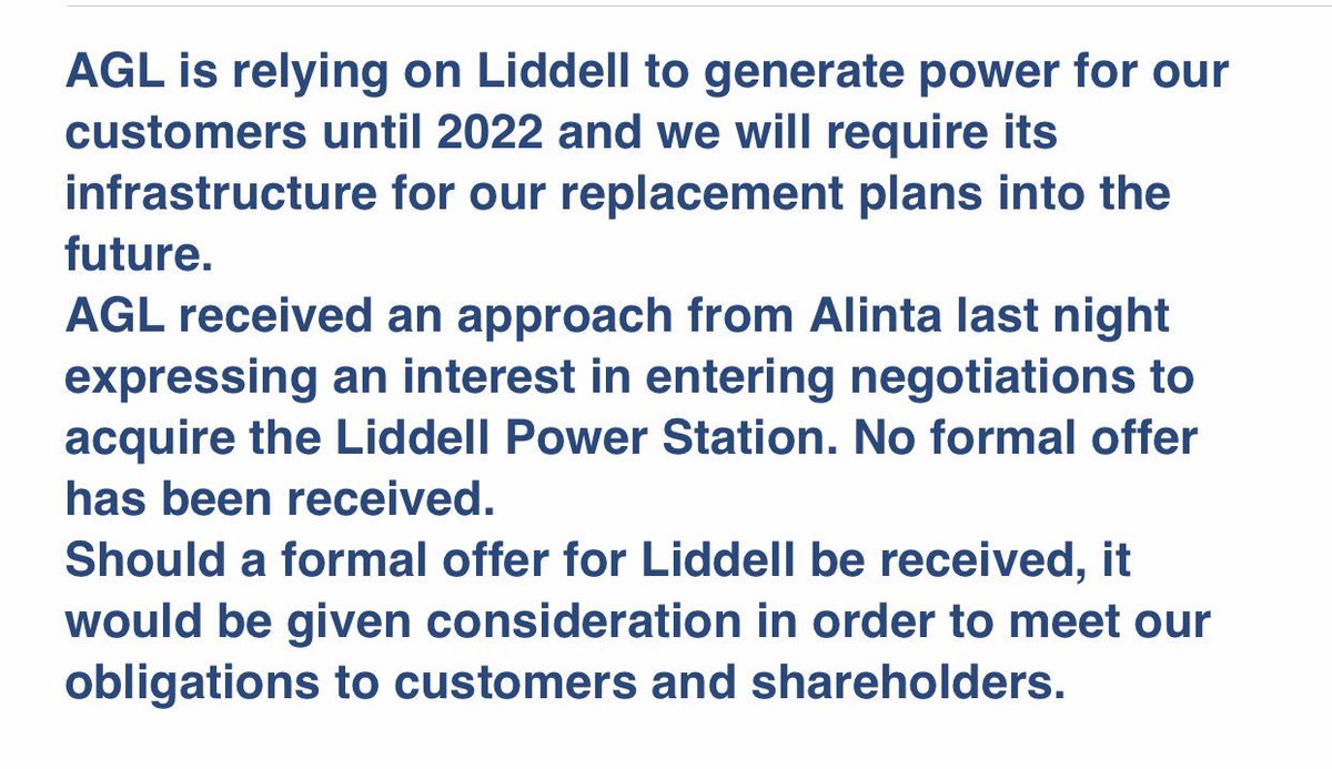 What Rod Sims has said in the past about AGL holding onto Liddell: “To be a misuse of market power it has to meet a range of tests, and a company being not willing to sell an asset doesn’t meet those tests" https://www.theguardian.com/australia-news/2017/sep/13/competition-regulator-agl-not-abusing-market-power-by-refusing-to-sell-liddell?CMP=share_btn_tw …
