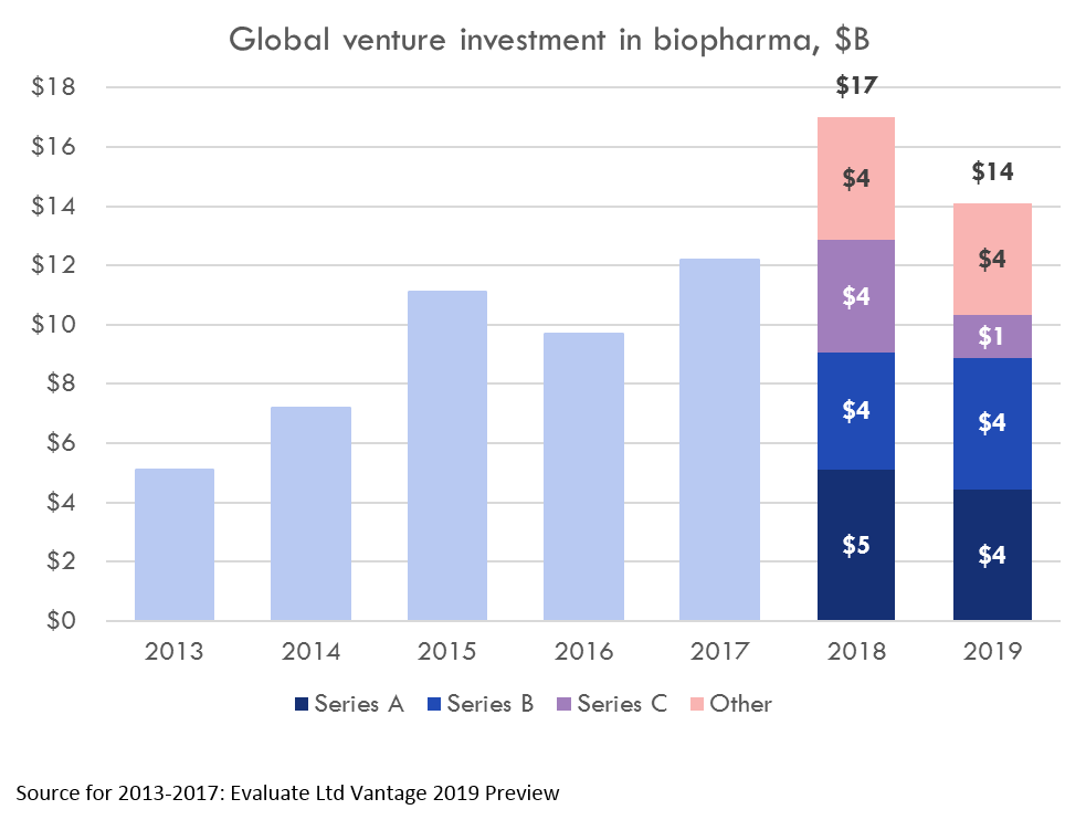 Quick pre-JPM recap of biotech startup funding and exits in 2019: venture funding of biopharma down modestly in 2019 from 2018. Series A down a bit, Series B up a bit https://www.baybridgebio.com/startup_database.html …pic.twitter.com/VXmVnchVaM