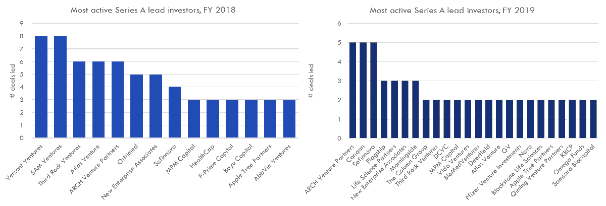 The most active Series A investors have changed from 2018 to 2019. By my count, ARCH, Canaan, and Sofinnova led the most Series A deals in 2019 (this is just based on PRs, stealth co's not counted) https://www.baybridgebio.com/blog/top_vcs_2018.html …pic.twitter.com/tSQgLPs9FG