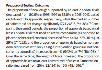 "The proportion of new [FDA] approvals supported by at least 2 pivotal trials decreased from 80.6% in 1995-1997 to 52.8% in 2015-2017"https://twitter.com/AlecGaffney/status/1217181650871836674 …