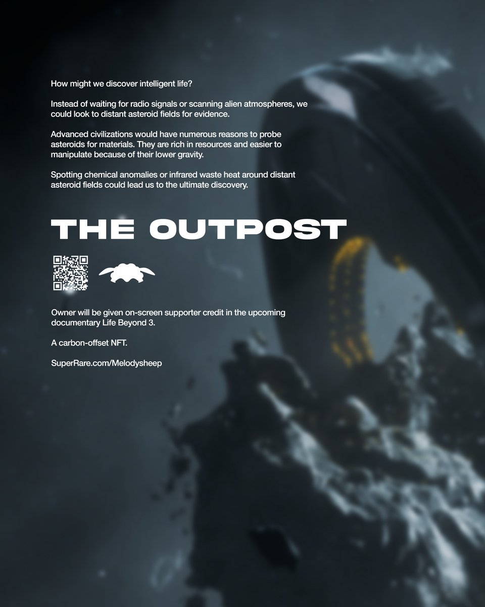 How might we discover intelligent life? Instead of waiting for a message, we could search distant asteroid fields for evidence of alien mining activity, via chemical anomalies or waste heat. Presenting THE OUTPOST. From the upcoming doc Life Beyond 3: https://superrare.com/artwork-v2/the-outpost-30028 …pic.twitter.com/z8g0wIiJFh
