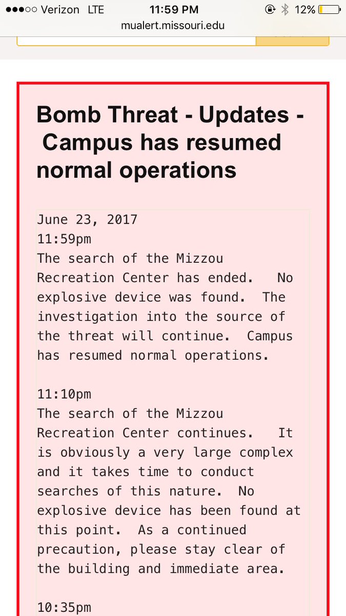 MUPD finished searching the Mizzou Recreation Center. No bomb was found.pic.twitter.com/1jC1YjpwfB