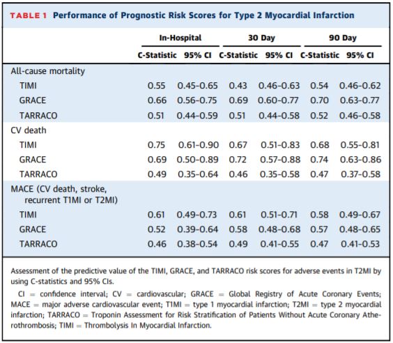 #JACC Research Letter from Drs.@SeanMurphyMBBCh,@jasonwasfy,@JJheart_doc et al. sought to compare the performance of the GRACE, TIMI, and TARRACO scores in patients with type 2#cvMI. Read their findings in the newest issue: https://bit.ly/2Rg1Dvx pic.twitter.com/wt2DghVoWV