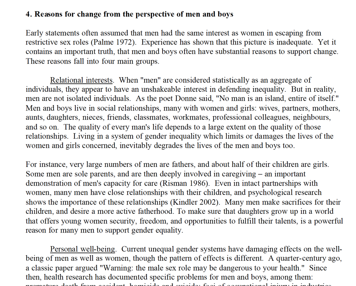 Men will benefit from progress towards gender equality. As preeminent masculinities scholar Connell outlines, pp. 12-14, men benefit in terms of their personal wellbeing, relations with others, and collective interests. UN Expert Group paper (2003), here: https://xyonline.net/sites/xyonline.net/files/2018-04/Connell%2C%20The%20Role%20of%20Men%20and%20Boys%202003.pdf …pic.twitter.com/qqKB2UL4wi