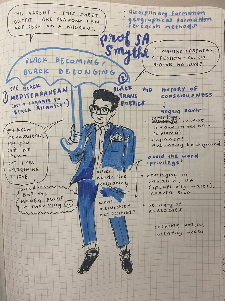 This term is already stepping on my neck (teaching 3 classes and an independent study), but a student in my grad class (“Blackness & Borderscapes”) drew her notes of the first meeting. I’m embarrassed but mostly honoured and impressed! Sharing with her permission