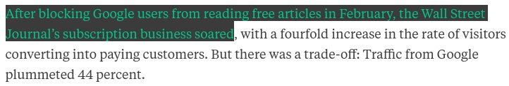 Search traffic plummeted 44 percent after WSJ tightened up its paywall. (But conversion to subscribership soared):https://www.bloomberg.com/news/articles/2017-06-05/wsj-ends-google-users-free-ride-then-fades-in-search-results …