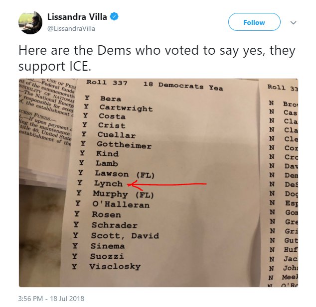 Odd. That was showing Lynch voted to support ICE with the R's and a handful of DINO's. Apparently deleted and reposted to fix something.https://twitter.com/RWwatchMA/status/1019686880584044545 …