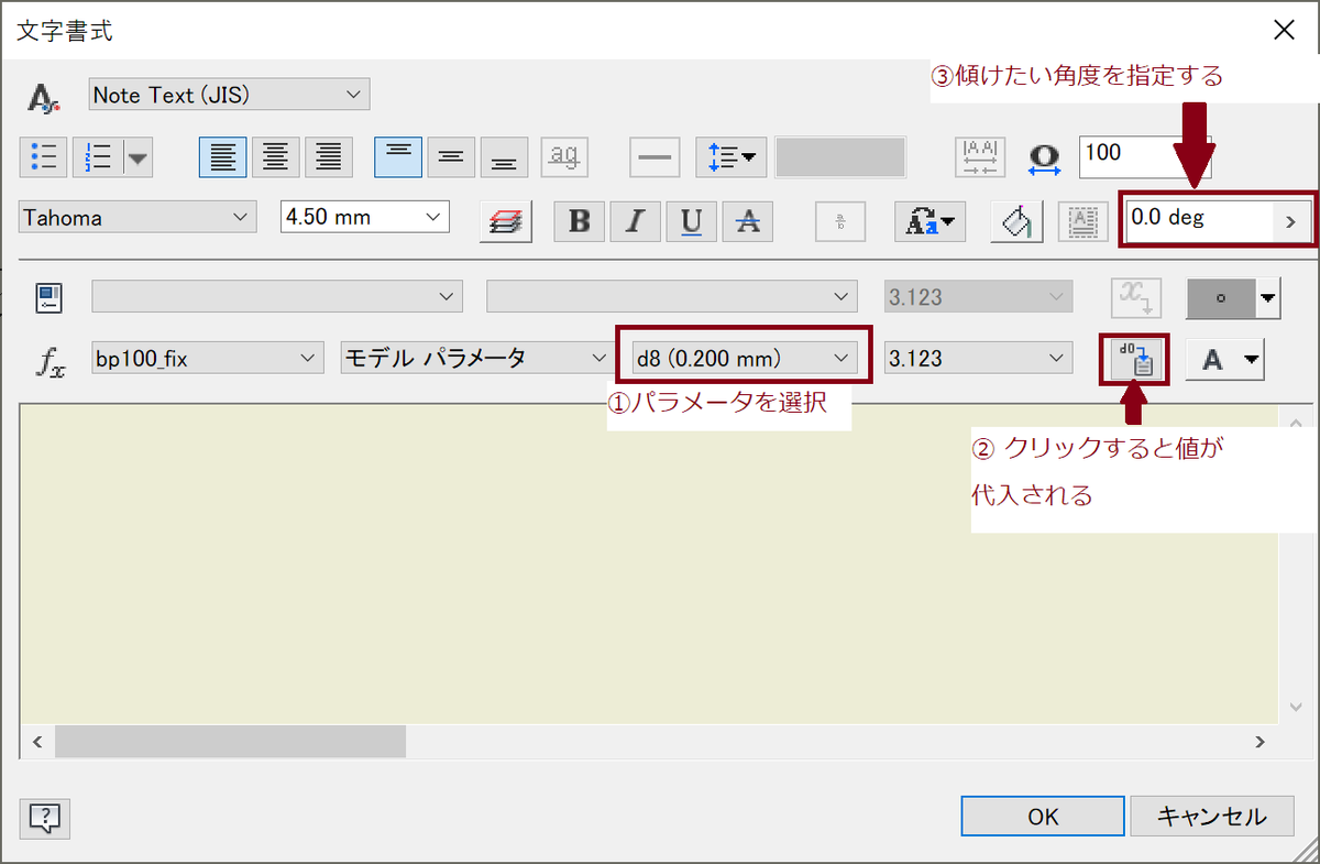 むむむ…。 文字ツールからモデルパラメータの値を拾ってきて無理やり任意の回転角で配置する、というのはできますがそこまでしたくないということですよね。