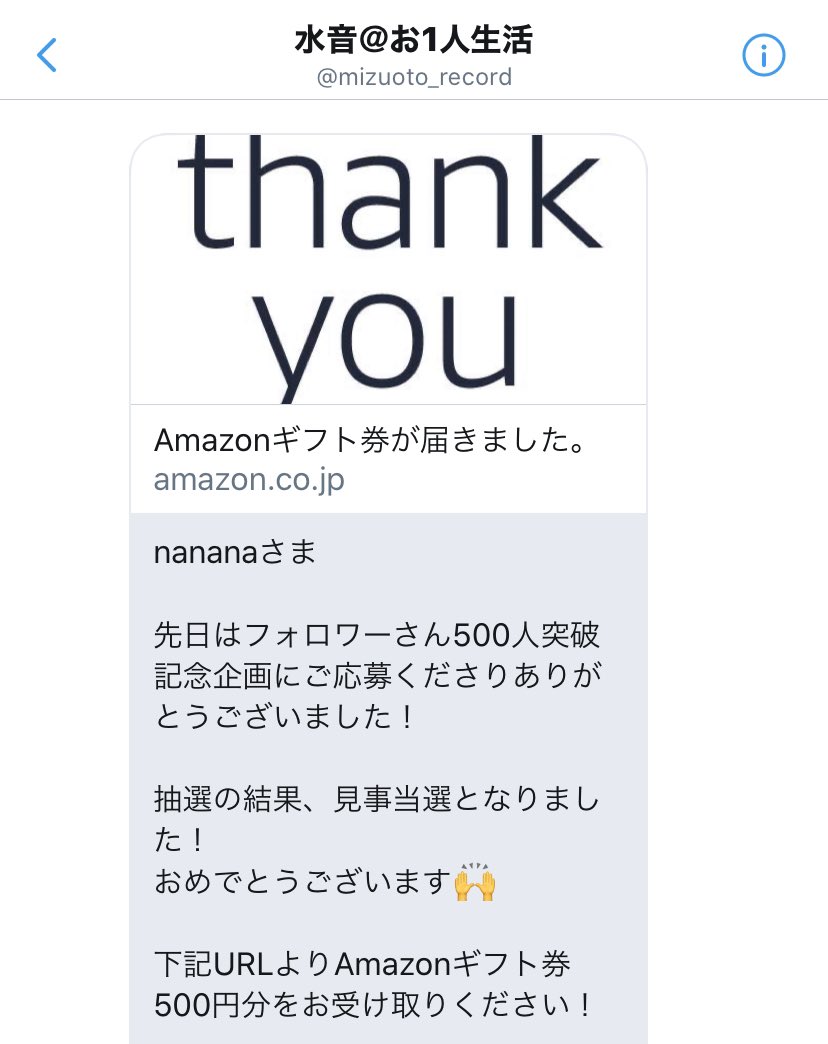 @mizuoto_record )様よりフォロワー500人突破記念企画当選のDMをいただきました٩( 'ω' )و ブログも面白い投稿ばかりで特にジャンクフードレシピはすでに真似させていただきました