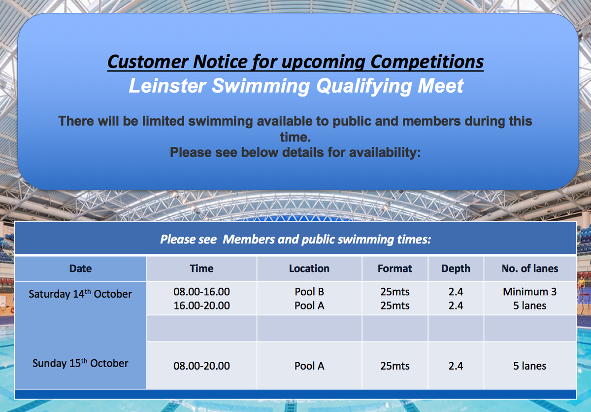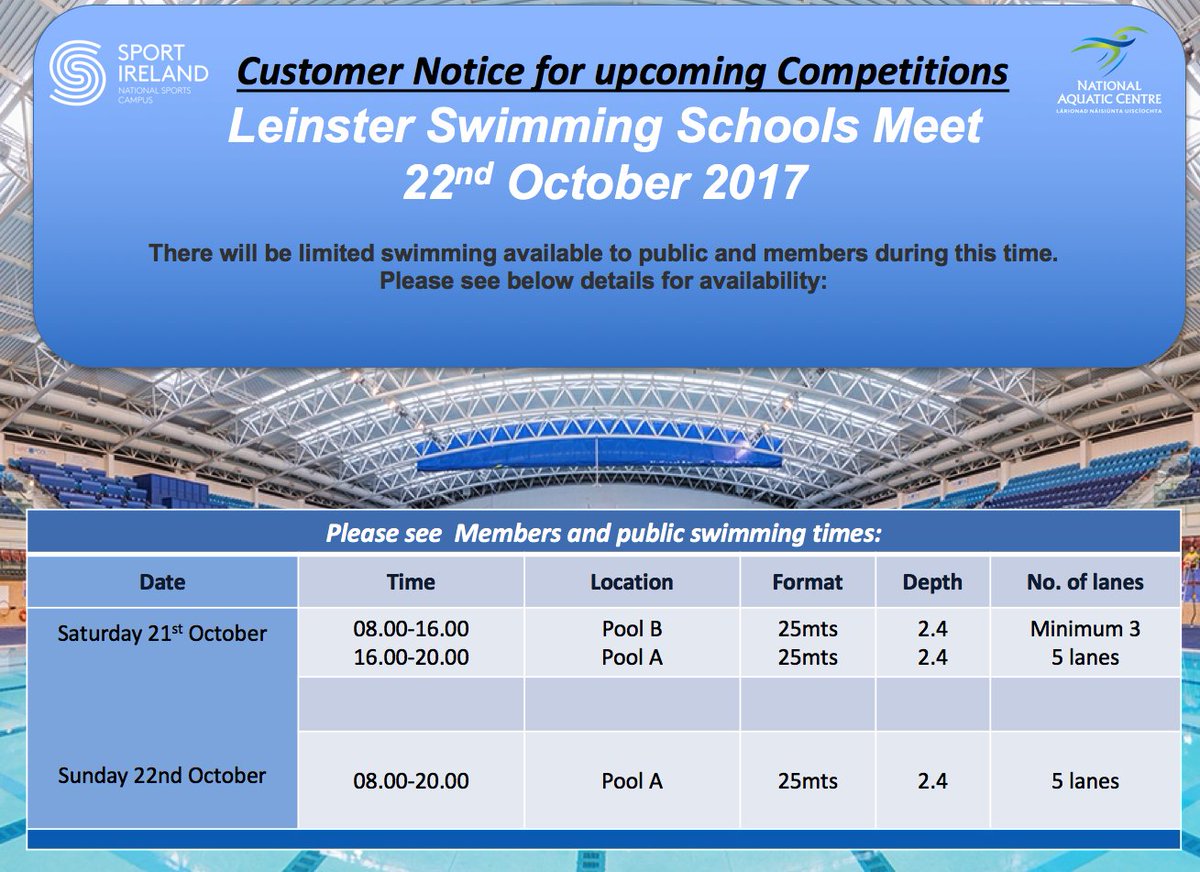 Leinster Swimming Schools Meet 21st & 22nd October 2017 with limited swimming available to public and members during this time, see below.pic.twitter.com/0xx7O659gN