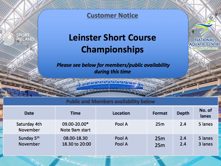 Leinster Short Course Championships are on this weekend the 4th-5th of November, please see pool availability belowpic.twitter.com/vF94ugbIQm