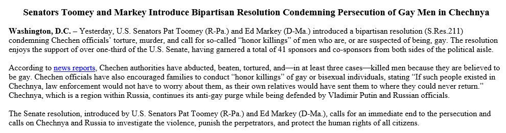 @SenToomey and 1 of Senate's most liberal voices,@SenMarkey introduce resolution condemning persecution of gay Chechens:pic.twitter.com/9n00iOeZdO