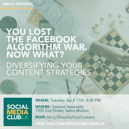 Happy Easter everyone! Don't miss this months SMCLA event focusing on content strategies outside of Facebook! This is a great networking opportunity and a great chance to learn new strategies from our panel of experts. https://buff.ly/2Gt11yD pic.twitter.com/y3Pi971FTo
