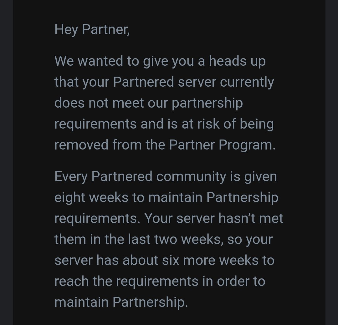 You know what Discord, at this rate you can just take the partnership away. Almost EVERY streamer has a Discord server and who am I to make them stay active in mine when they have their communities to focus on? I want conversation not people spamming "good morning" and go. 🤷🏻‍♂️pic.twitter.com/tOxYsSIMFR