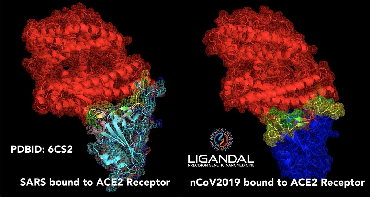I ran thermodynamic simulations and sequence alignment to model the binding pocket and critical residues of nCoV2019 binding to the ACE2 receptor. The first picture is a crystal structure of SARS bound to ACE2, the second is a simulation of nCoV2019 with ACE2.pic.twitter.com/Zsx3rvoMKD