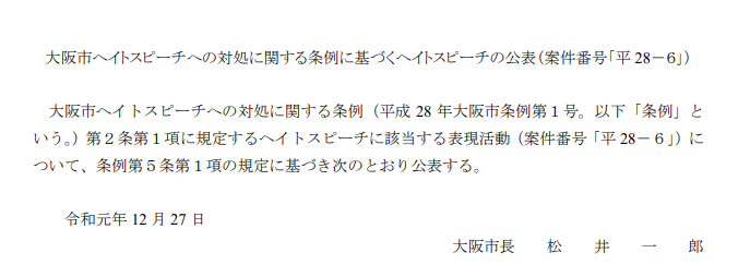 大阪市の松井一郎市長が、独自の審査会がヘイト認定した他市住民2名の氏名を公表しました。警告により該当表現を削除しても処罰したそうです。ヘイトスピーチはいけない事ですが、行政が他自治体住民を裁くことが許されるのでしょうか?添付は大阪ヘイト条例にも有効。自衛のために拡散お願いします。 https://twitter.com/kotamama318/status/1204172576227856384 …pic.twitter.com/2XEywE0fuj