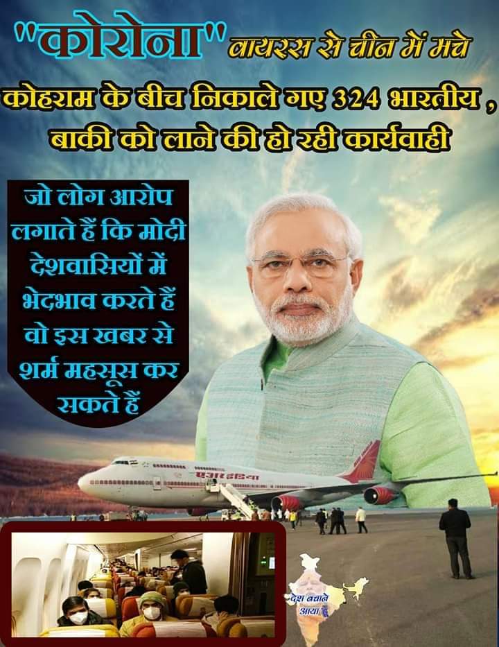 #चीन के बुहान शहर में डेडली#कोरोना वायरस फैला हुआ है,एयर इंडिया का जहाज 324 भारतीयों को बचा कर सकुशल भारत वापिस लेआया है,सबकी गहन चिकित्सा और जांच चल रही है। बाकियों को लेने वापस फिर से रेस्क्यू टीम चीन रवाना हो गयी।त्वरित फैसले लेने के लिये मोदीजीऔर गृहमंत्री शाह को बधाई