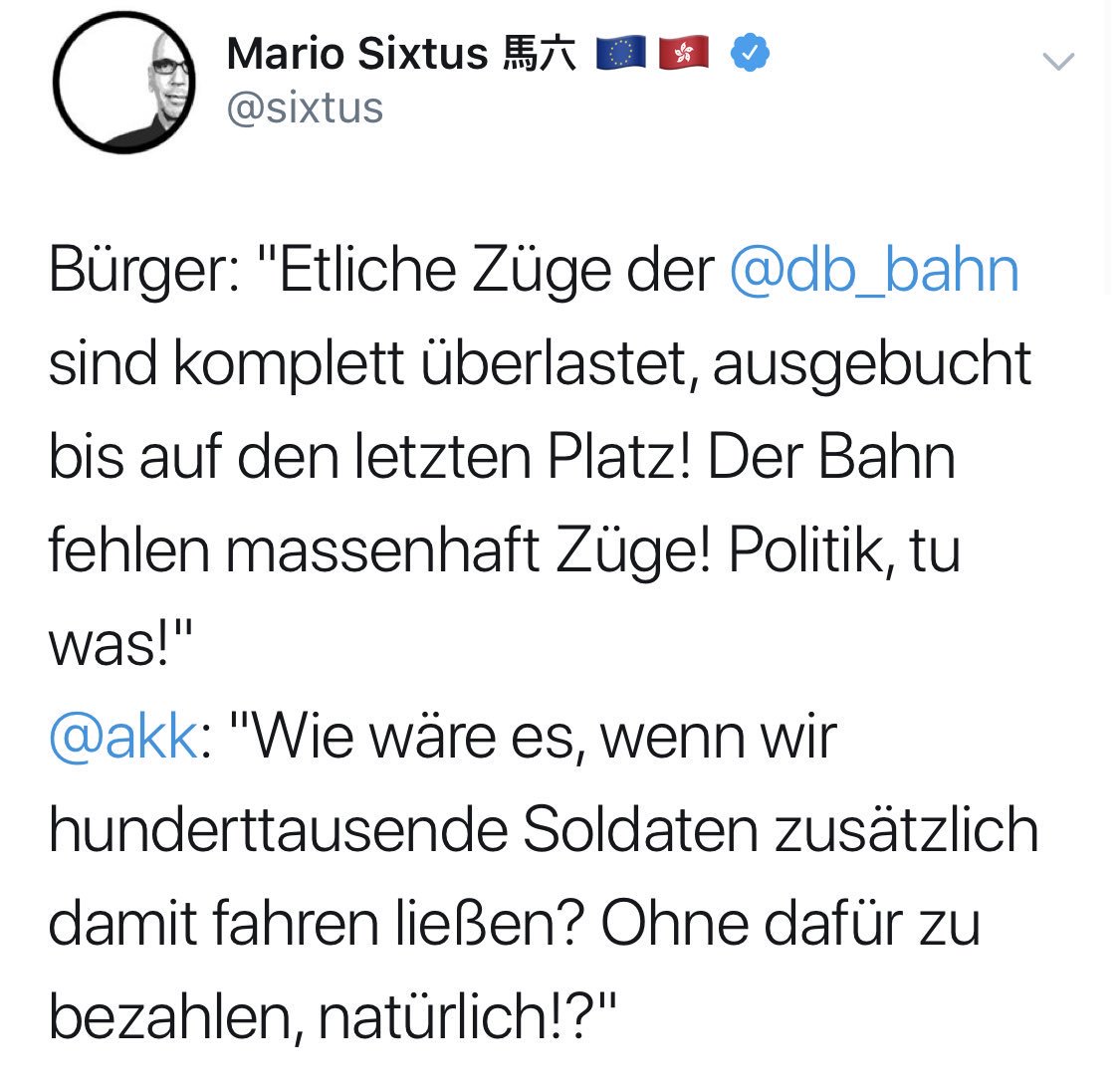 Die Bundeswehr hat aktuell 180.000 Soldaten. Die Deutsche Bahn hatte letztes Jahr 150 Millionen Reisende. Mario Sixtus:pic.twitter.com/ZhD9kHVcQ0