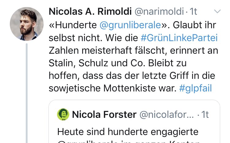 Ach Gähn. Das von jemandem, der gerade die Grünliberalen mit Stalin gleichgesetzt hat und auch sonst einfach faktenfrei rumpöbelt. Das Pöbeln sei dir verziehen, das Faktenfreie nicht.